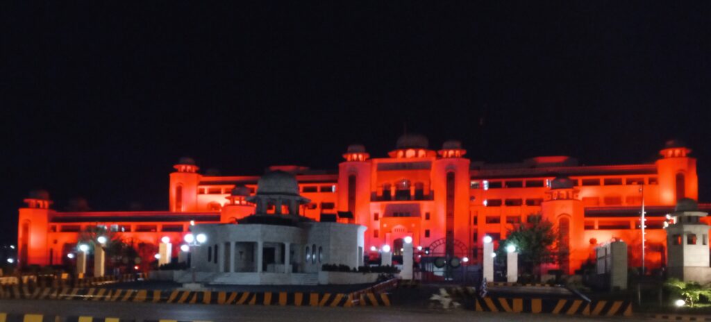 ISLAMABAD: The federal capital’s skyline turned radiant on Tuesday night as major government landmarks, including the Pakistan Monument, Aiwan-e-Sadr (President House), Parliament House, Prime Minister House, Supreme Court, High Court, federal secretariat, and key offices along Constitution Avenue and Blue Area, were illuminated in red to mark China’s National Day (October 1st).