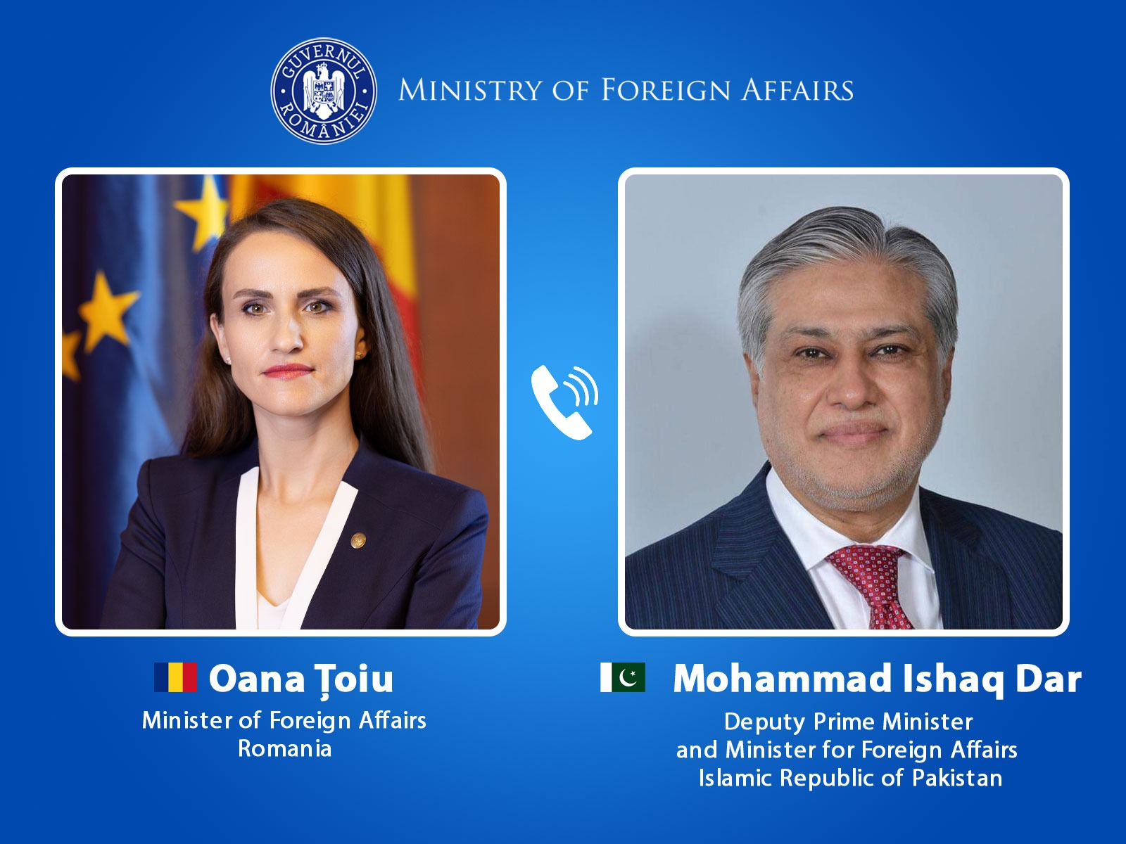 Islamabad/Bucharest: Romania’s Foreign Minister held a telephonic conversation with Pakistan’s Deputy Prime Minister and Foreign Minister, Senator Mohammad Ishaq Dar, to discuss recent developments in the Middle East, including the Islamabad Talks.