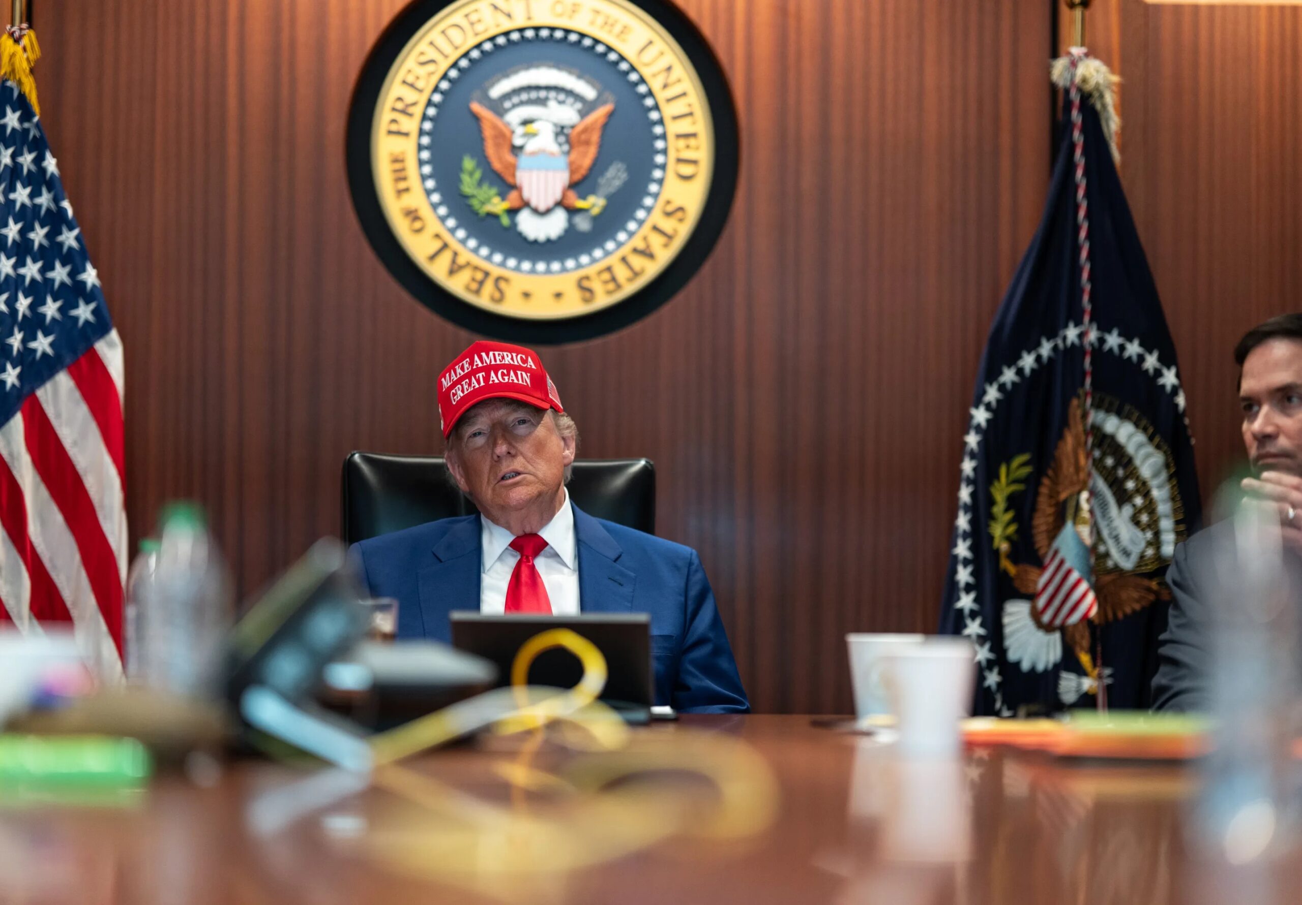 Other senior officials present included White House Chief of Staff Susie Wiles, special envoy Steve Witkoff, CIA Director John Ratcliffe, and Chairman of the Joint Chiefs of Staff Dan Caine.